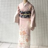本加賀友禅色留袖。藤色がかった桜色に加賀友禅で染められた鏡裏文様。正倉院に伝わる豪華な宝鏡が元になっており、魔除けや神聖な意味合いも持つとされています。 背には一つ紋。訪問着仕立てです(比翼なし)。白の帯と紫の帯締めで若々しく。